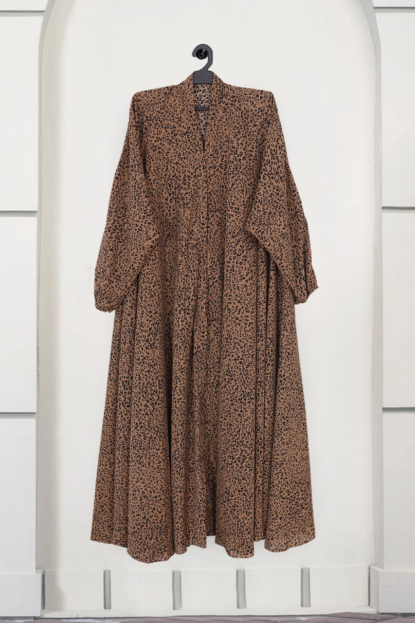 Discover our printed front open abaya, crafted from lightweight georgette fabric for ultimate comfort and elegance. This abaya features stylish elastic sleeves for a perfect fit and effortless chic.