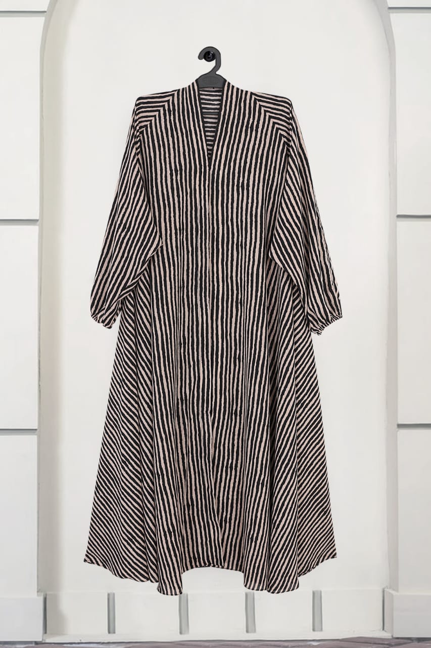 Discover our printed front open abaya, crafted from lightweight georgette fabric for ultimate comfort and elegance. This abaya features stylish elastic sleeves for a perfect fit and effortless chic.