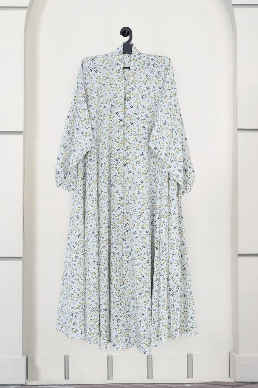 Discover our printed front open abaya, crafted from lightweight georgette fabric for ultimate comfort and elegance. This abaya features stylish elastic sleeves for a perfect fit and effortless chic.
